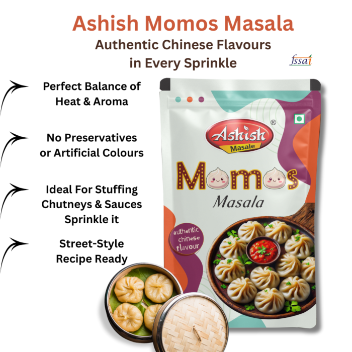 Buy Ashish Momos Masala – a premium blend for authentic Chinese-style momos, chutneys, and sauces. Pure ingredients, zero preservatives, and a perfect balance of taste and aroma. Fast shipping across India.